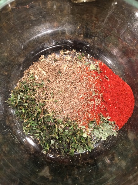 Mix together salt, thyme, oregano, cayenne pepper, paprika, black pepper and fennel seeds.