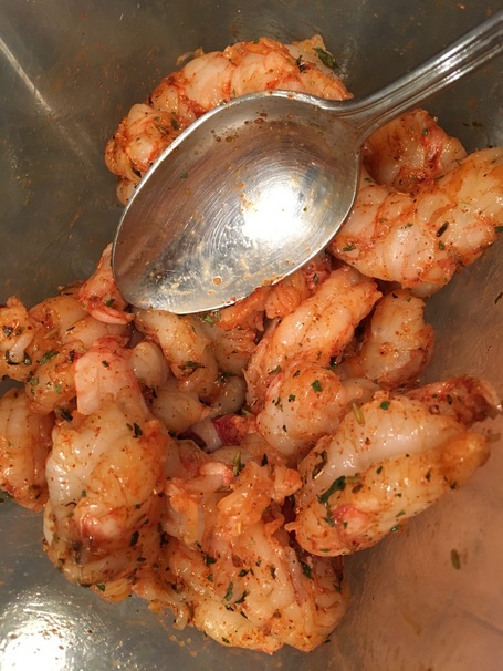In a large bowl, toss shrimp with spice mixture until all pieces of shrimp are evenly coated. Set aside to marinate for a few minutes while you prepare the mango salsa and begin to cook quinoa or your favorite grain blend, according to package instructions.