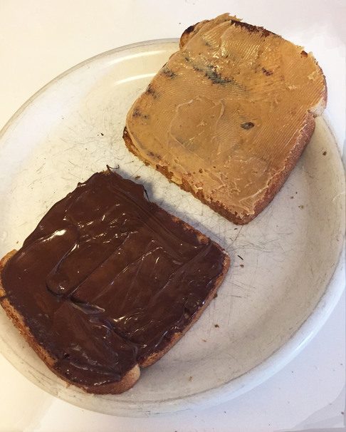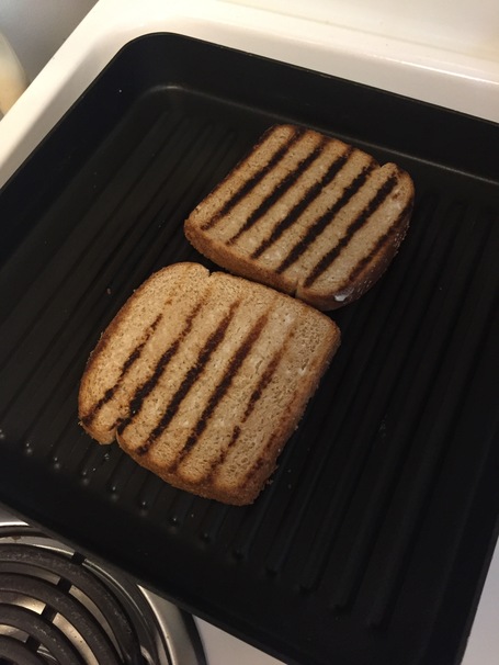 Instead of just breaking up a chocolate bar and plopping it in between two slices of bread, we decided to treat the chocolate as a spread. By microwaving in twenty-second intervals, stirring in between, we melted the chocolate before spreading it on one side of the sandwich. Honestly, I would have been happy eating the “sandwich” just like that– but we had a challenge to finish