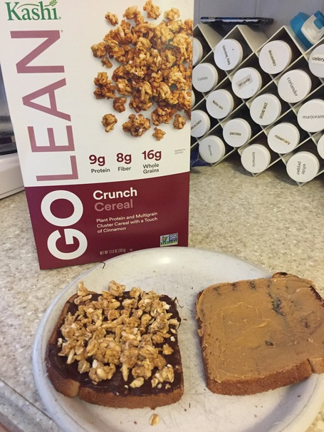 No, it’s not dessert (and yes, I’m a firm believer that dessert is a meal). For some crunch and always-necessary extra carbs, we spread a layer of Kashi Go Lean Crunch on one side of the sandwich. We chose smaller pieces that would still add a fun texture without making the sandwich impossible to eat.