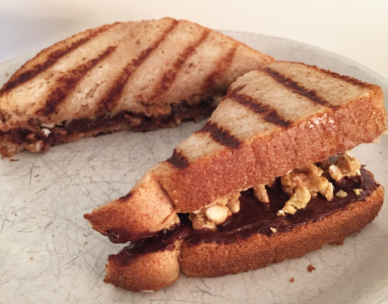 Our wonderful creation was basically a dessert panini. The salty-sweet peanut butter-chocolate combo was, like always, magic. The pieces of Kashi were the perfect size and were only slightly sweet without being cloying. I’ve got plenty of favorite foods (sweet potato broccoli sandwich anyone?) and lots of bread options, so there’s nothing stopping me from trying this “challenge” again.