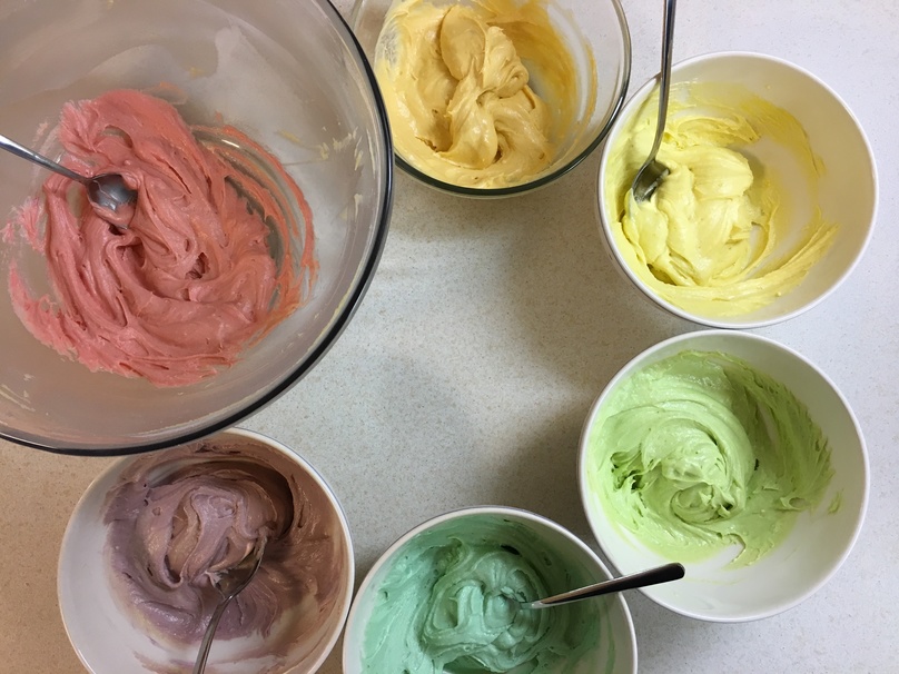 Divide the mix into 6 bowls, and stir in a few drops of food colouring (red, orange, yellow, green, blue, and purple) until you’re happy with the colour.