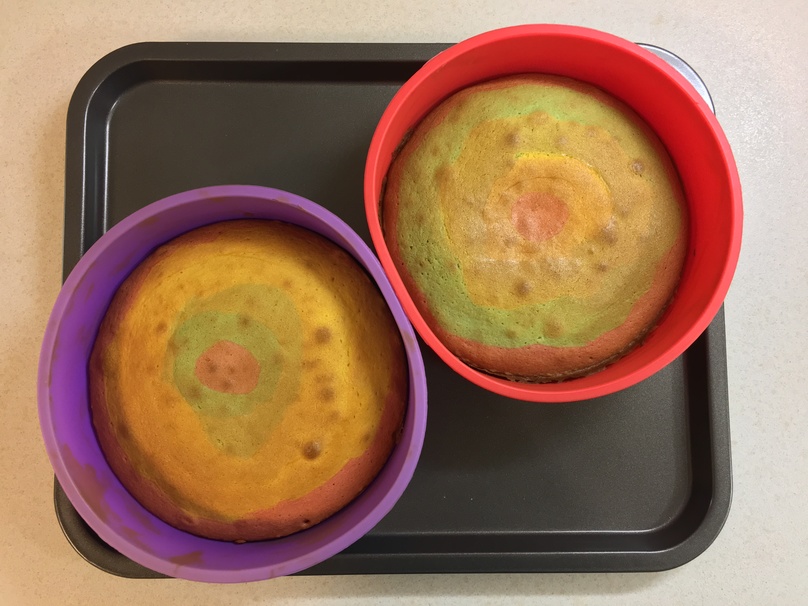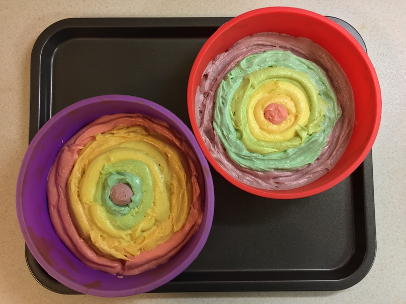 Pipe rings of cake mixture into the two tins. (The colour that’s used as the outer ring of one tin will be the inner ring of the other tin, and uses the mixture up nicely!)