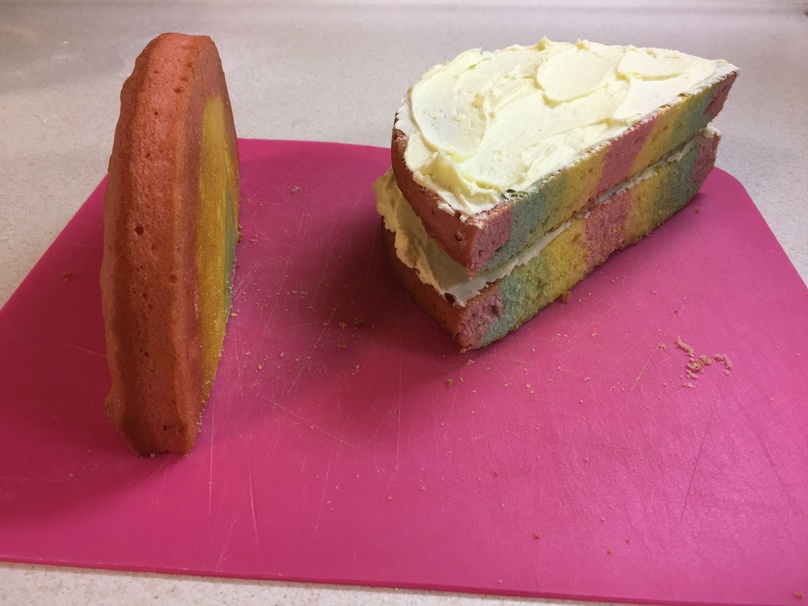 Cut the cakes in half to make semicircles, and sandwich them together with the buttercream icing.