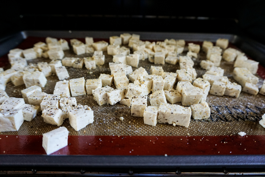 Cut the tofu into small cubes. Cover your baking sheet with a thin layer of olive oil. This will keep your tofu from sticking as it bakes. Scatter the tofu cubes on the baking sheet, and drizzle a touch more oil on top before seasoning with salt, pepper, and garlic powder. Then gently toss the tofu around, making sure the cubes are evenly coated. Bake at 350ºF on the top rack for 30 minutes, giving the tofu a toss about halfway through. This time use tongs unless you like crispy fingers too!