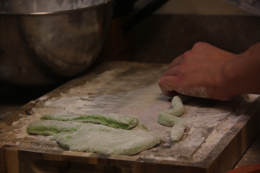 Roll the dough into a rope and cut into bite-size pieces.