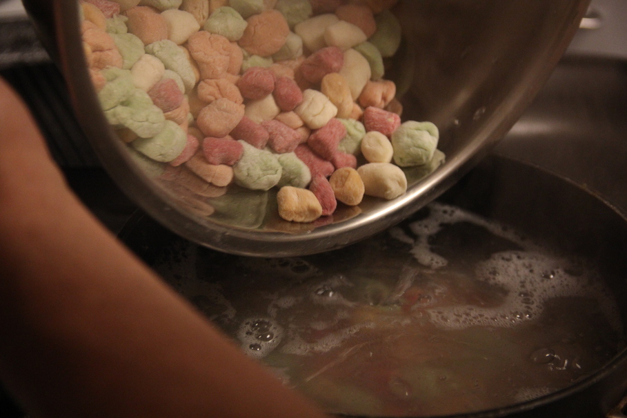 Throw bite sized pieces into the boiling salted water to cook. After 15 seconds, scrape the gnocchi off of the bottom of the pot (it might stick).