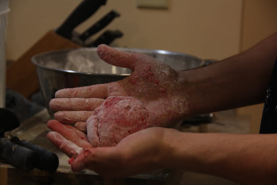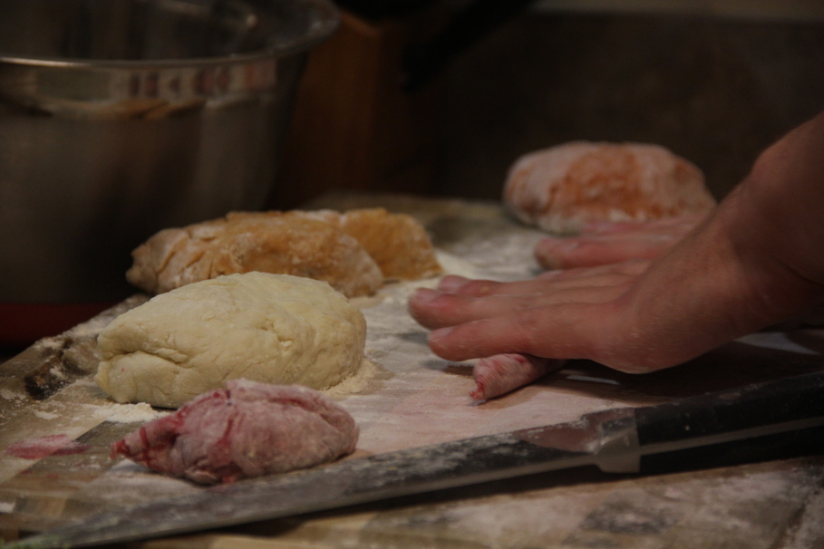 Mix the flour and the beet pureé (blend beets and water together until puréed) in a bowl until a dough forms. Add more flour, if needed, and be careful not to knead the dough too much. These should be clouds of pasta.