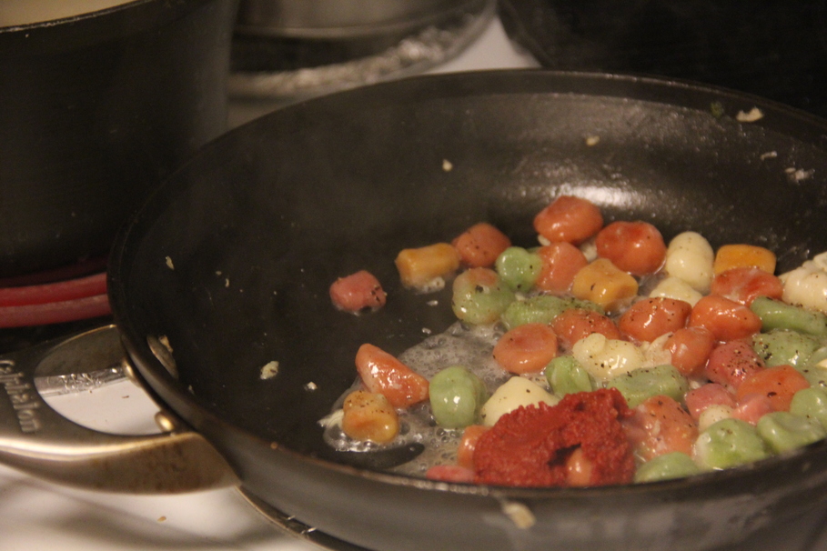 Toast the garlic and pepper in the oil. Toss the boiled gnocchi in and toss the mixture. Then, insert tomato paste and pasta water.