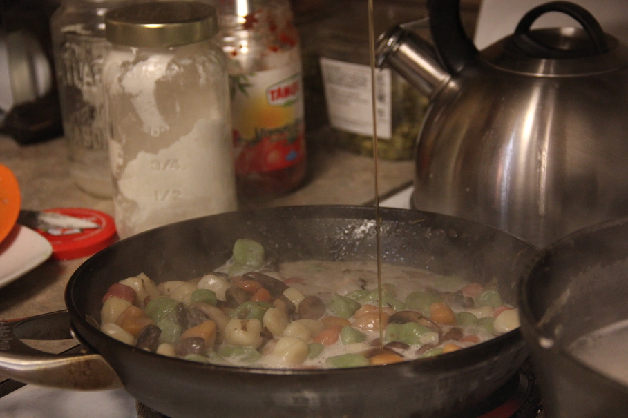 Once the mushrooms are cooked, throw in the cooked gnocchi and sauteé. After about 10 seconds, mix the gnocchi and throw in the coconut yogurt, pasta water, and maple syrup.