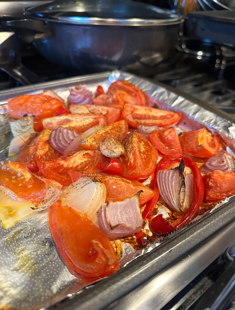 Spread out all the veggies on a large baking tray and drizzle oil over all of the veggies. Roast the veggies at 400° Fahrenheit for 1 hour. In a blender, add two cups of water/broth and all the roasted veggies.