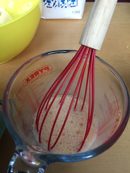 Slowly stir in the eggs and the flour a little bit at a time until it is well mixed. Add the pandan flavouring and mix in.