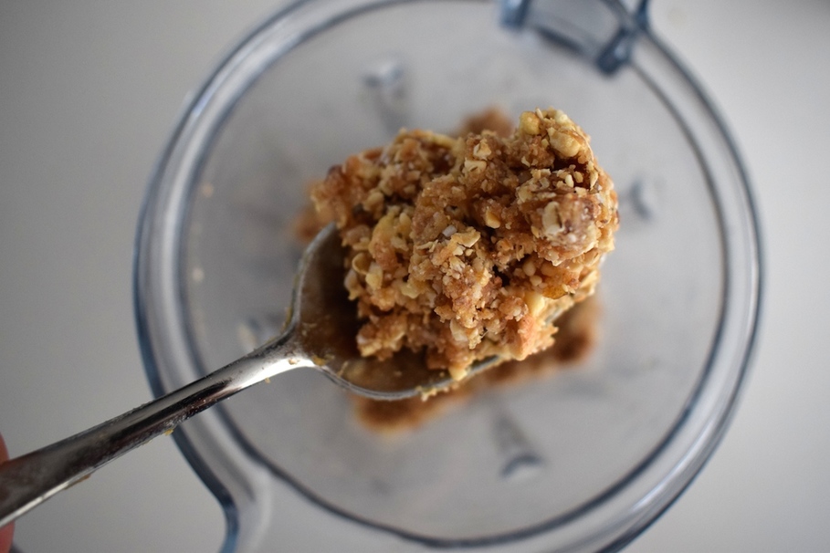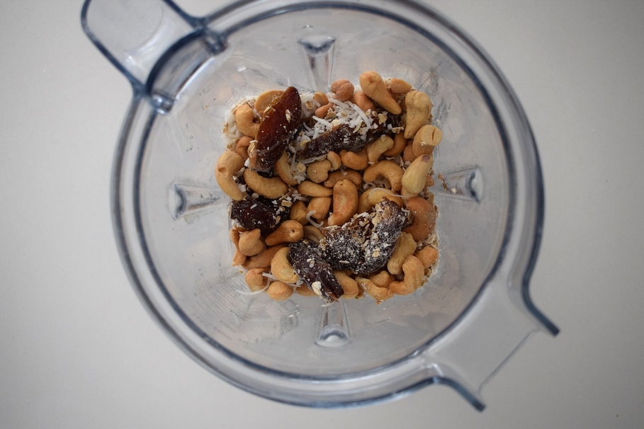 In a blender, combine cashews, shredded coconut, rolled oats, and pitted Medjool dates.