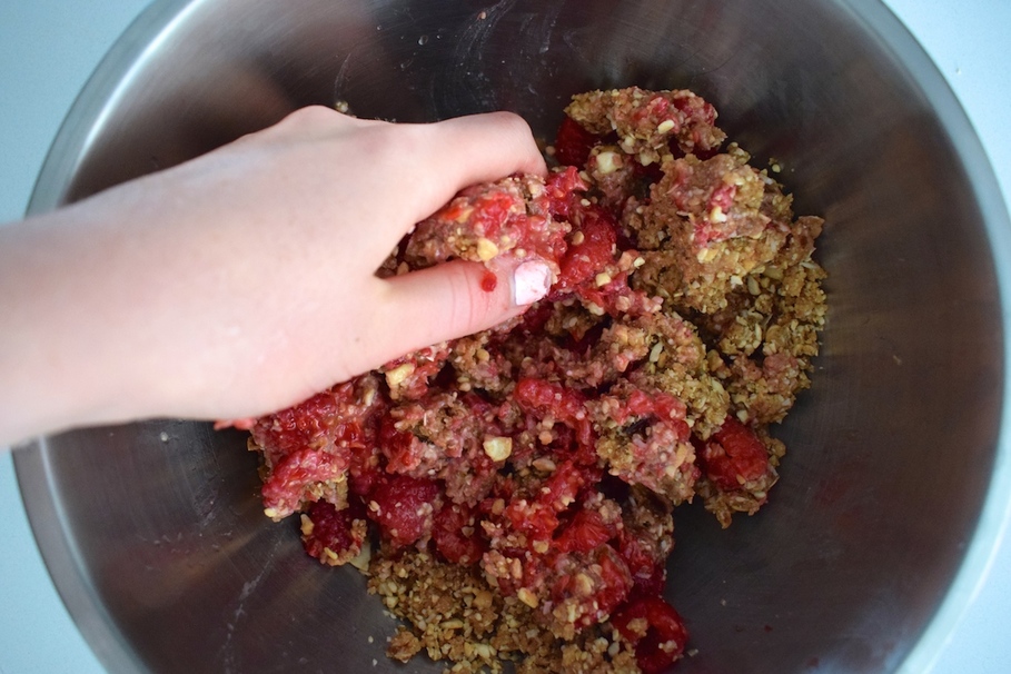 In a medium-sized bowl, use your hands to combine the cashew mixture with 1 1/2 cup raspberries until a wet dough forms.