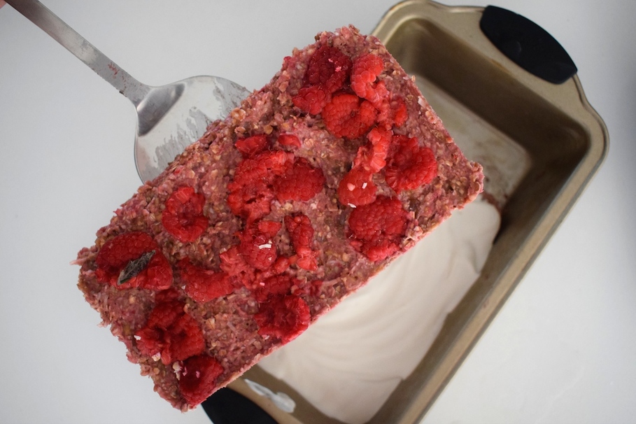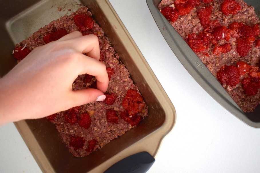 Use the remainder of the raspberries to top each half of the mixture, then chill both tins in the freezer for an hour.