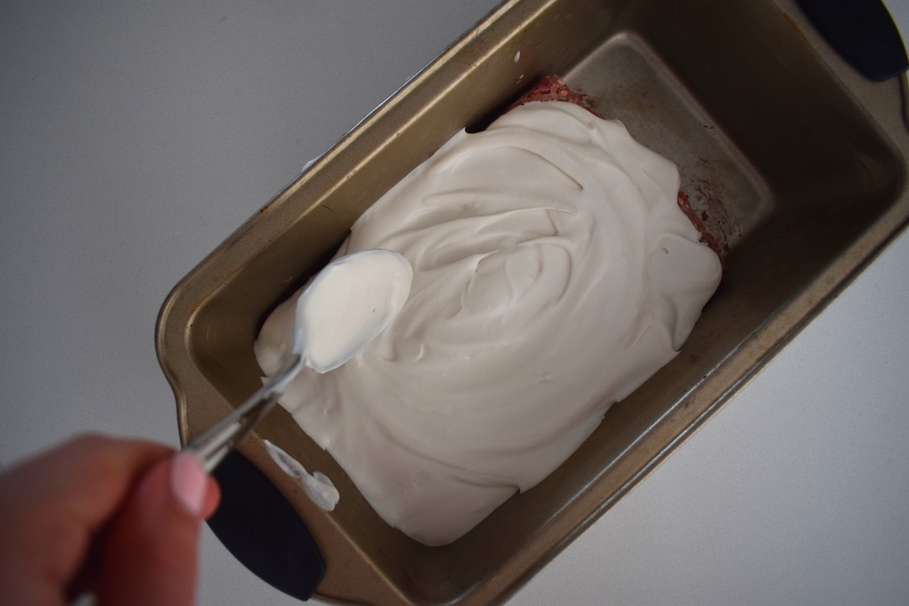 Remove one tin from the freezer. Spread the maple coconut cream on top of the raspberry layer, then chill for an additional 45 minutes.