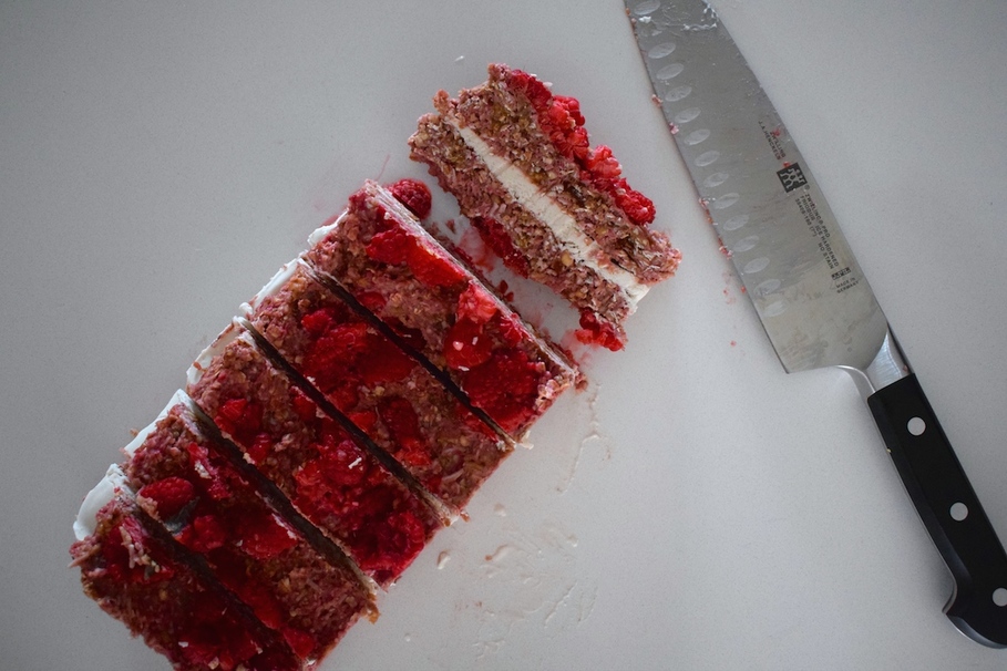 Use a sharp knife to slice the raspberry coconut bars into six slices.