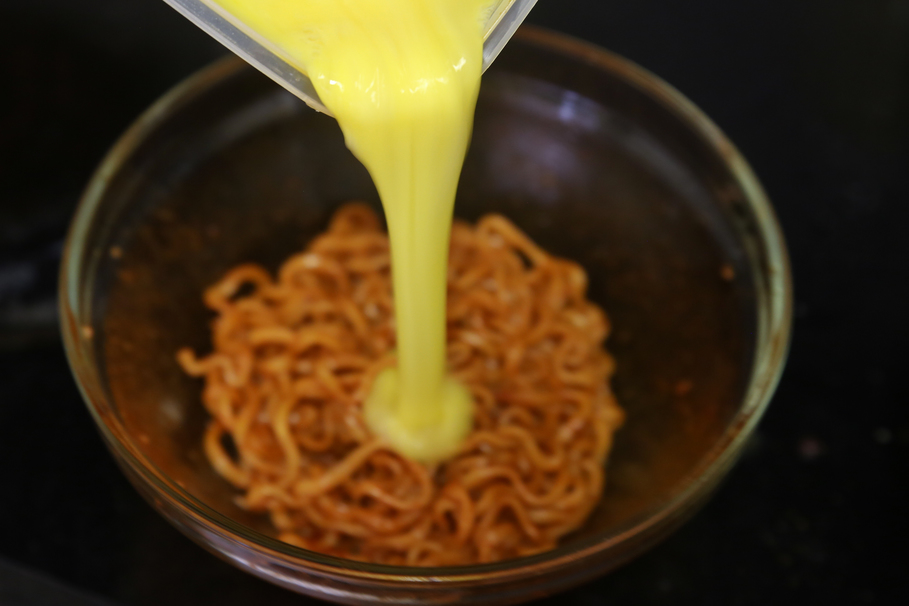 Beat one egg in a small mixing bowl. Add it to the ramen and stir until evenly coated with the egg. Divide ramen into 2 portions and place into separate bowls, preferably with a flat base.
