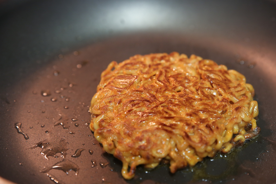 Place a sheet of plastic wrap over the ramen and flatten the noodles using a heavy can or a bottle to achieve a bun shape. Refrigerate until firm for at least 15 minutes.