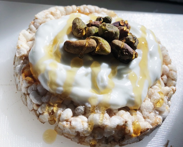 What you need: rice cake, greek yogurt, pistachios, and honey