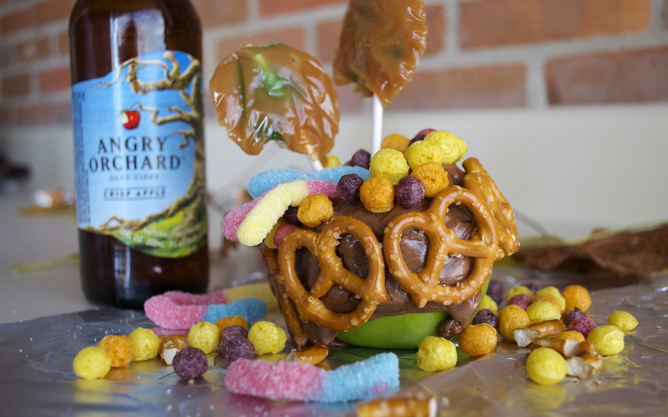 Decorate with pretzels, Trix, gummy worms, and lollipops, then pour the Angry Orchard cider into the apple. Bottoms up.