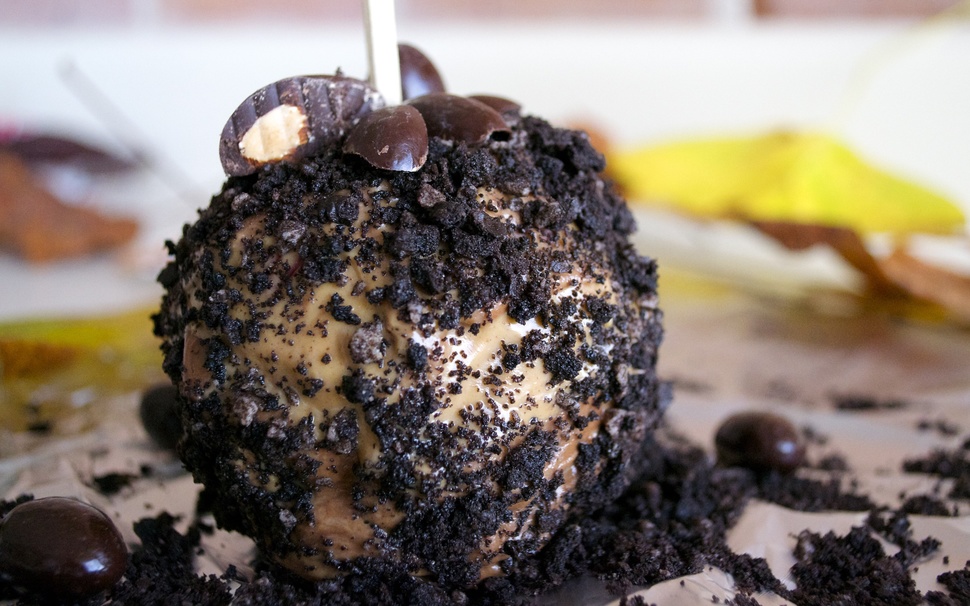 They’re creepy and they’re kooky, this apple’s really spooky–the Addams family. Badadadump *snap snap.* Just like the Addams family, this apple isn’t too appealing on the the outside, but one bite into this chocolate-covered almond, Oreo, and peanut butter apple and you’ll be hooked.