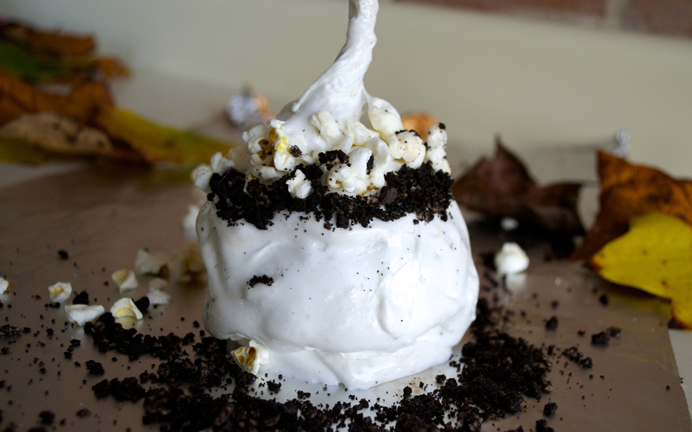Spread the marshmallows all over the apple, and top it off with some popcorn and Oreos.