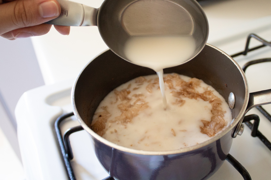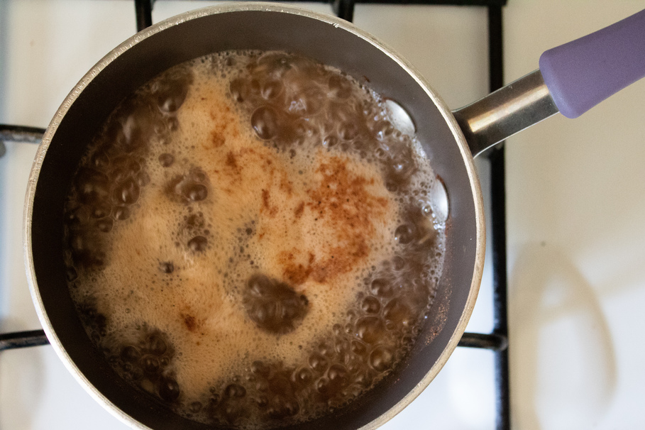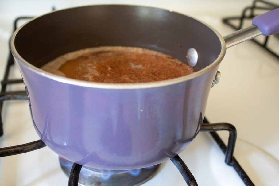 Add all the ingredients except for the milk to a small sauce pot over medium-high heat.
