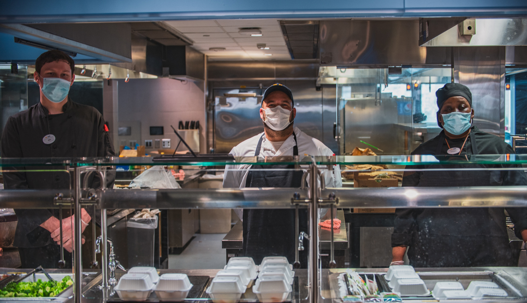 Dining hall staff didn’t find out that students were allowed to return to campus until the week before classes began. Luckily, the team had created several different plans and were able to respond effectively to the news by creating a streamlined, socially-distanced dining hall flow offering to-go meals.