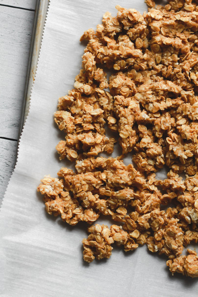 Line a baking tray with parchment (to stick to my waste-less intention, I used a silicon reusable baking mat). Spread the granola onto the cookie sheet, careful not to break it up to much, as we want to keep those delectable crunchy clusters! Bake the granola for 15 minutes, then remove from oven and carefully flip the granola, trying to keep the pieces relatively intact to guarantee the formation of clusters. Return to the oven and bake for another 10 minutes, or until the edges are nicely browned and the cashew-esque aroma begins to permeate throughout your whole kitchen.