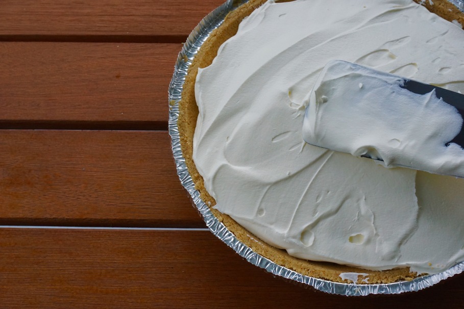Spread an even layer of the cooled condensed milk (toffee time!) on top of the pie crust.
