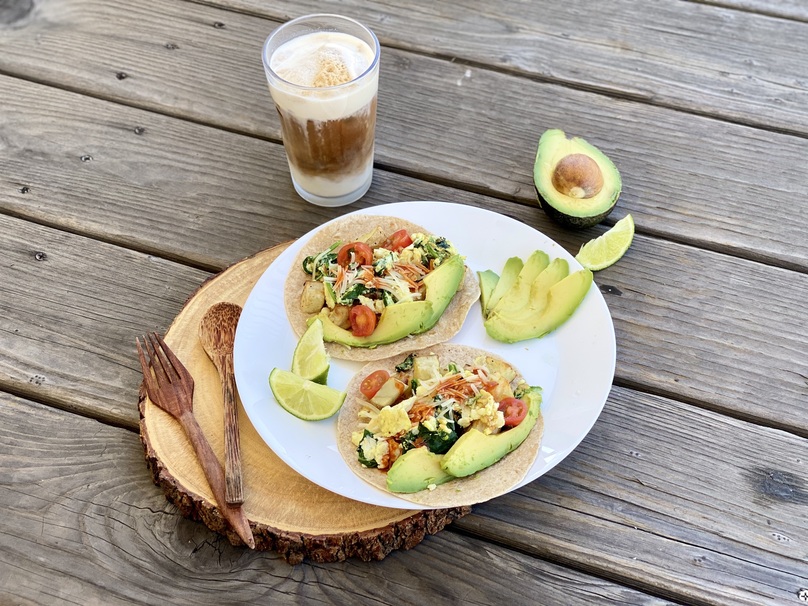 For these breakfast tacos, you’ll need corn or flour tortillas, egg whites, a potato, spinach, tomato, an avocado, and a sauce of your choice. If you can handle spice, top it with hot sauce but if not, add in some mild salsa for more flavor.