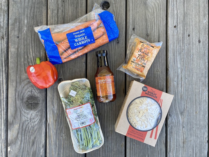 For this noodle stir fry dish, you’ll need 1 pack of Trader Joe’s Thai wheat noodles, teriyaki marinated tofu, broccolini, red pepper, carrots and your choice of sauce. For this recipe, I used Trader Joe’s General Tsao stir fry sauce.