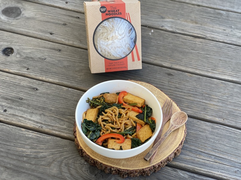 Chop your tofu, bell pepper, and broccoli and preheat the oven to 400 degrees. Then drizzle with oil, lightly salt, and bake your vegetables and tofu for 25-30 minutes. Once you have heated the oil in a pan, toss in your Thai wheat noodles and sauce. After cooking for 5 minutes, add in vegetables and baked tofu.