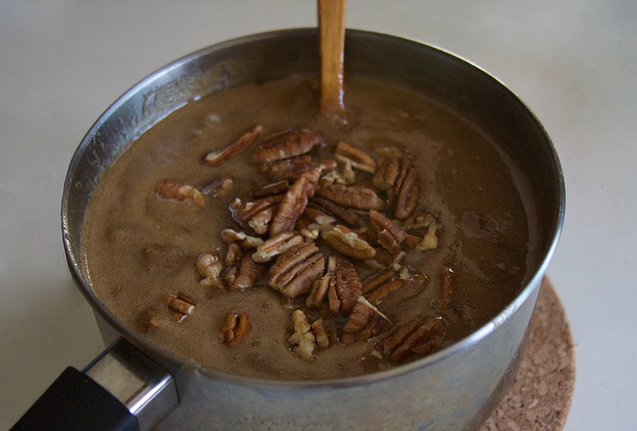 Bake for 15 minutes, or until the crust has set. Remove the shortbread from the heat and allow to cool at room temperature, but keep the oven on. While the crust bakes, you can begin preparing the filling. Begin by heating a large saucepan or pot over low heat. Coarsely chop pecans.