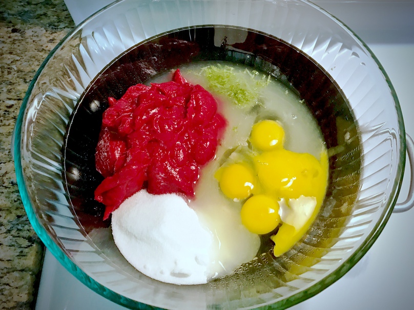 Cook purée from previous step, 3 eggs, 2 egg yolks, 1 tsp. lemon zest, 1/2 cup lime juice, salt, 1/2 cup sugar and 1 tsp. lime zest in a heatproof bowl set over a saucepan of simmering water (a double boiler). Stir frequently with a rubber spatula and scrape down sides of the bowl often until mixture thickens and coats spatula (about 8-10 minutes). Let it cool until just warm.