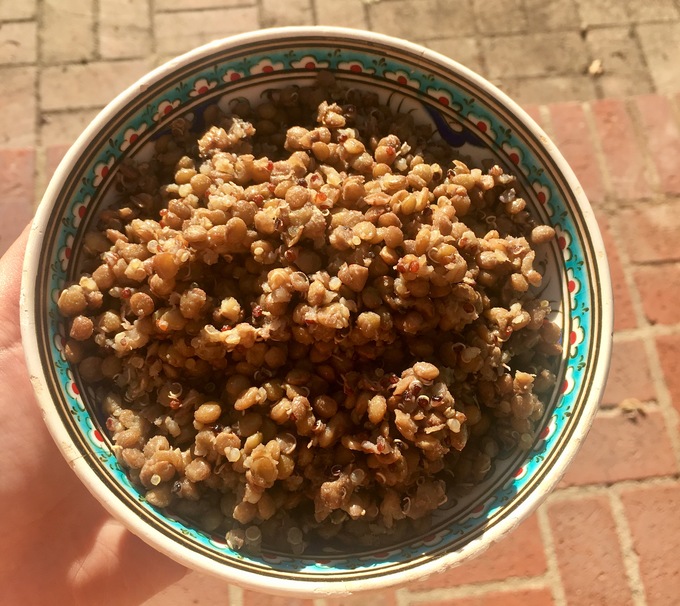 If using uncooked lentils, place the lentils and quinoa in a medium pot and add water until it reaches the level of the grains. If using pre-cooked lentils, cook the quinoa separately and add the lentils with the other ingredients in step 3.