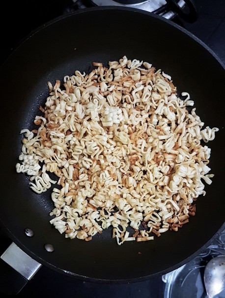 Crush the noodles with your hands and add them to the butter. Stir till the noodles become golden-brown.