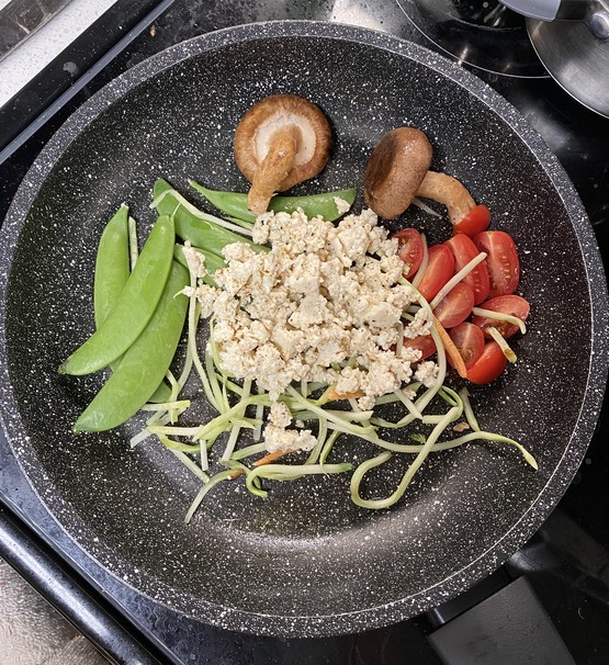 Add tofu crumbles and seasoning as necessary. This will serve as the ‘egg’ that is otherwise used in a stir-fry. Cook until the crumbles are well integrated into the vegetable mix.