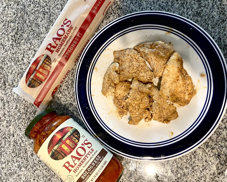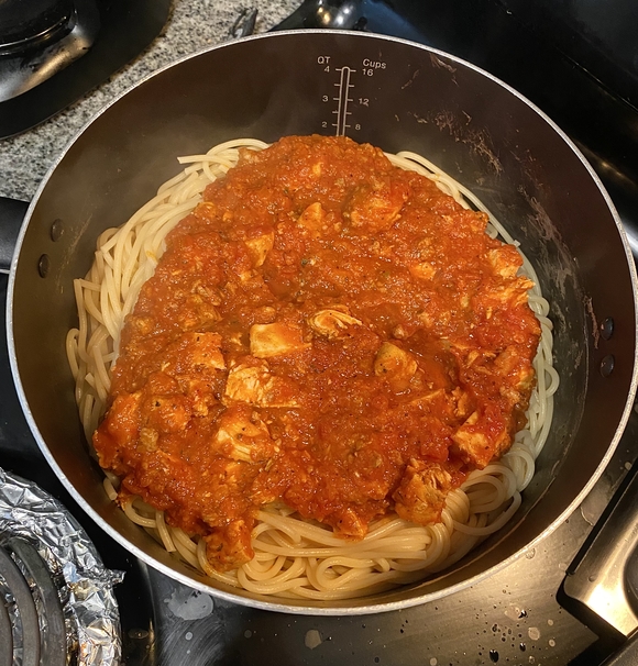 After the chicken has been in the pan for a while, pour in your marinara sauce. Stir the chicken with the marinara while all the ingredients cook. If you have some Italian seasoning, throw it in there to get that true pasta taste!