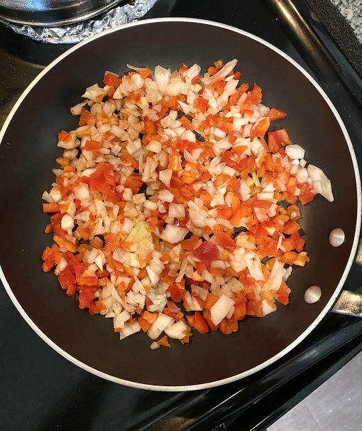 Cut your bell pepper and onion into tiny pieces. Try to get them as small as possible. Set them aside once done. Get a medium-sized pan and place it on the stove. Set it to medium-high heat and drizzle some olive oil onto the pan. Once the pan is heated, toss in your vegetables. Stir that around for a few minutes or until they start to turn a brownish color.