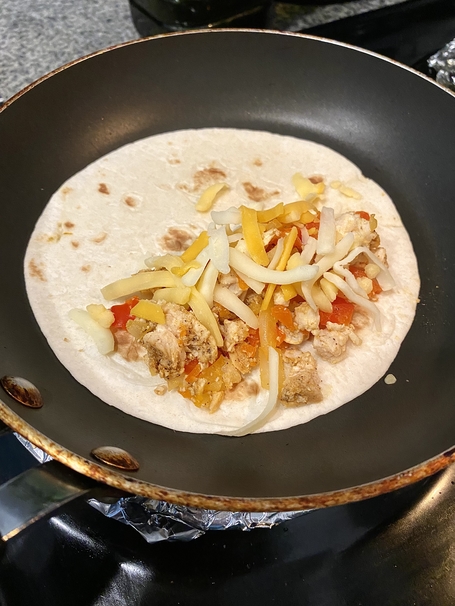 Take another small pan and place it on the stove. Set the pan to low-medium heat and drizzle some olive oil. After the pan is heated, take a tortilla and place it on the pan. Then, take your chicken and vegetable combination and place it on one half of the tortilla shell. Sprinkle some cheese on top of the chicken.