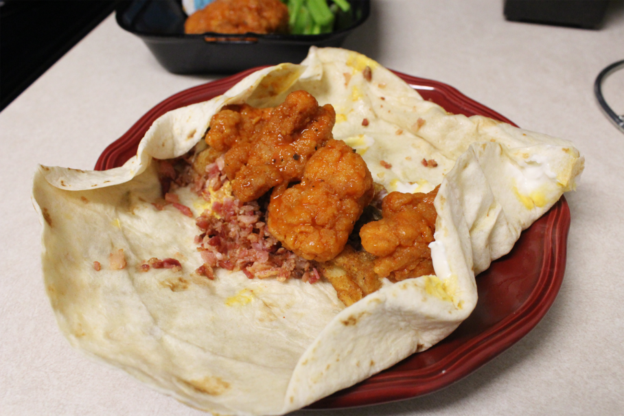For my first fast food hybrid, I decided to mix the tangy Tongue Torch Boneless Buffalo wings from Zaxby’s with Taco Bell’s Loaded Potato Griller. The griller is full of bacon, potatoes, cheese and sour cream. So, I thought the kick of the buffalo would sit perfectly in the wrap. And for any fellow ranch fans, pour a little of Zaxby’s ranch in it before re-wrapping the griller for a little extra creaminess. This combo was definitely the most exciting and bold-tasting of the mash-ups I created. The crunch of the wings fit perfectly in with the softer texture of the potatoes, while the creaminess of the sour cream and cheese accented all the flavors very well.