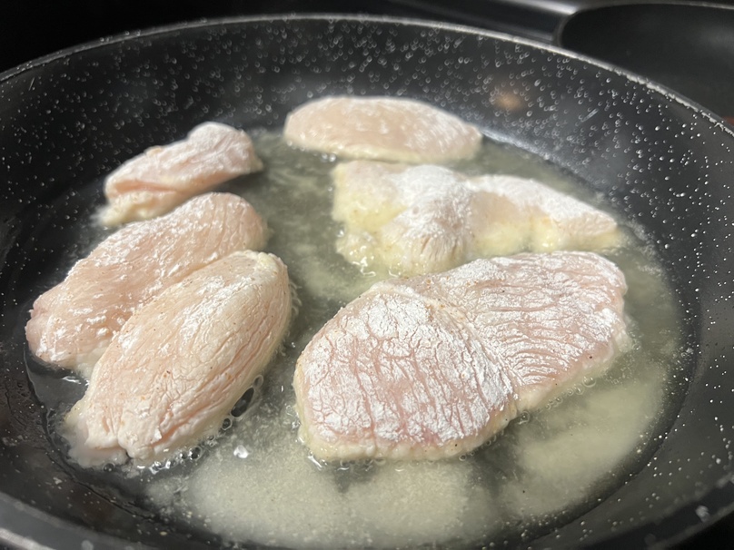 Once the chicken is dipped in the cornstarch and dusted, you can carefully add it to the hot pan. After about two to four minutes, make sure to flip the chicken to ensure both sides get cooked. Don’t cook it too long, because it will go back into the pan with the sauce to cook some more.