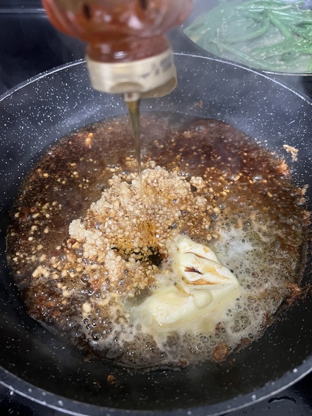 In that same pan, add about a half a stick of butter, a spoon full of minced garlic (or seven to eight garlic cloves), two tablespoons of honey, and three tablespoons of soy sauce or teriyaki sauce. If you like a thicker, saucer chicken, just add more butter, honey, and soy sauce!