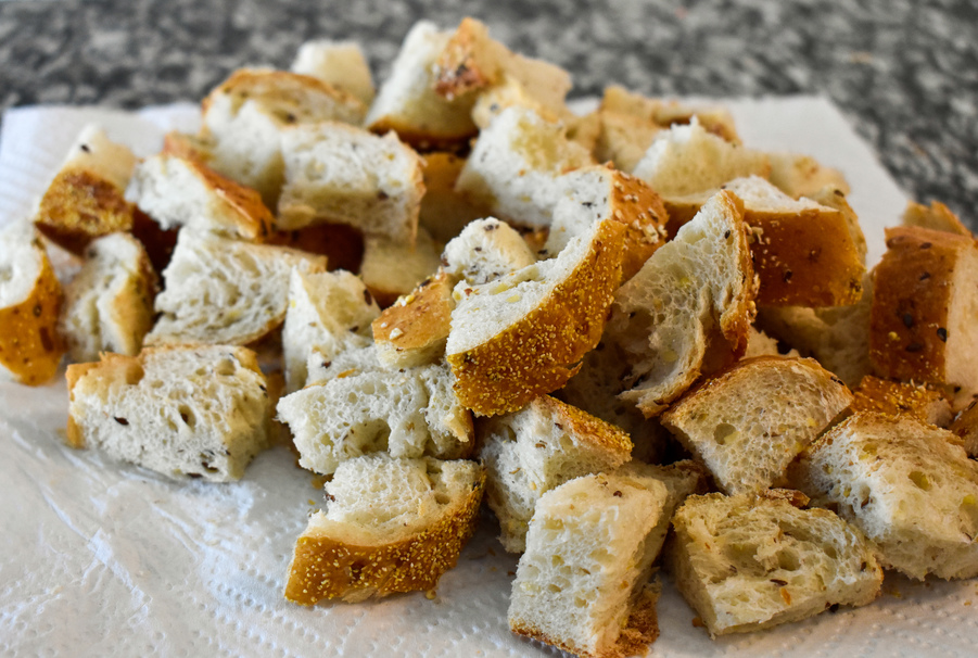 First, you will need to cut your bread into cubes. Preferably, you want to do this the night before so there is time for your bread to dry out.
