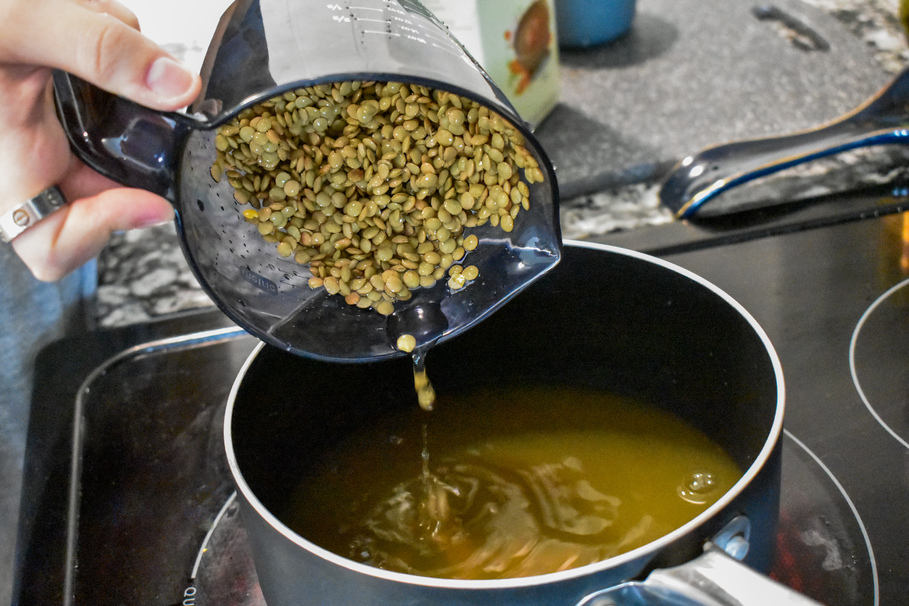 Add 1 ½ cups of vegetable broth to a saucepan. Then, rinse ¾ cup lentils in cold water and add that to the saucepan with the vegetable broth. Cook this over medium-high heat until there is a low boil. Lower to a simmer and have this cook for 20-30 minutes.
