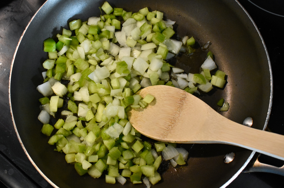 Sauté the diced ½ cups of onions and ¾ cups celery in olive oil and add salt and pepper. Cook for 5 minutes until it looks golden. Mix 1 tbsp flax egg with water in a cup and set aside.