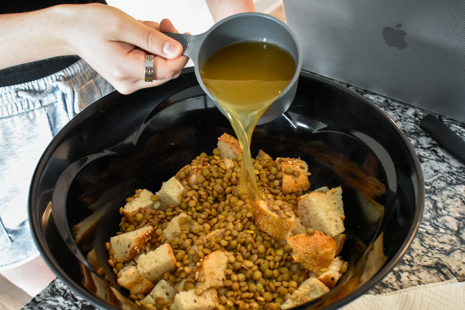 Now, add the remaining 1 ½ of vegetable broth, onions, celery, sage, flax egg, and lentils into the bread bowl and mix all of the ingredients together. Transfer the mixture to the pan you prepared earlier and covered it with foil. Bake for 45 minutes. After that, it is ready to enjoy!