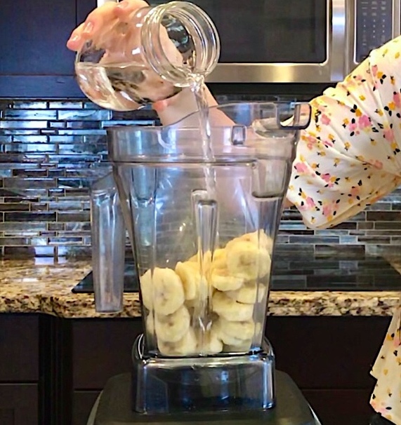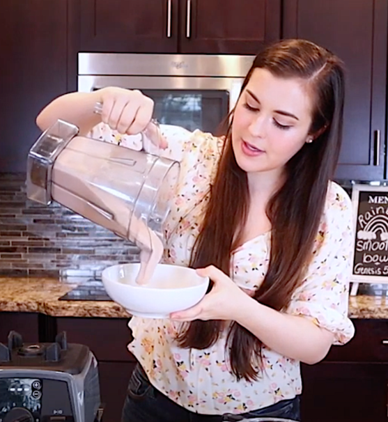 In a blender blend: frozen bananas, splash of water or almond milk, protein powder, and the colorful fruit or veggie of your choice. Adjust thickness of smoothie by adding more or less water or almond milk. (The more liquid you add, the more liquidy your smoothie will be. A thicker smoothie is best so that the toppings stay still on top.)
